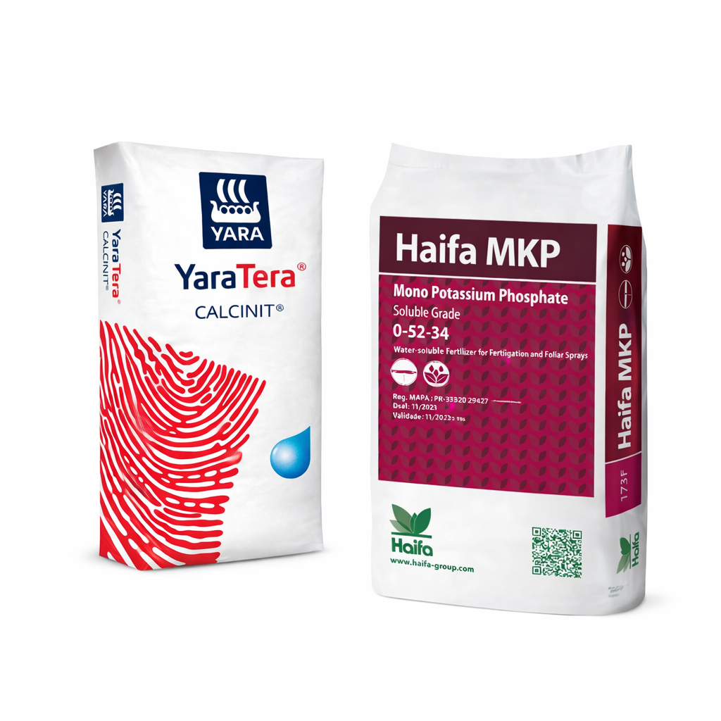 O Kit Nitrato de Cálcio + MKP 0-52-34 é um conjunto de adubos minerais (fertilizantes) 100% solúveis em água, amplamente utilizados no agro para fornecer nitrogênio, cálcio, fósforo e potássio, nutrientes essenciais para o desenvolvimento completo das plantas.