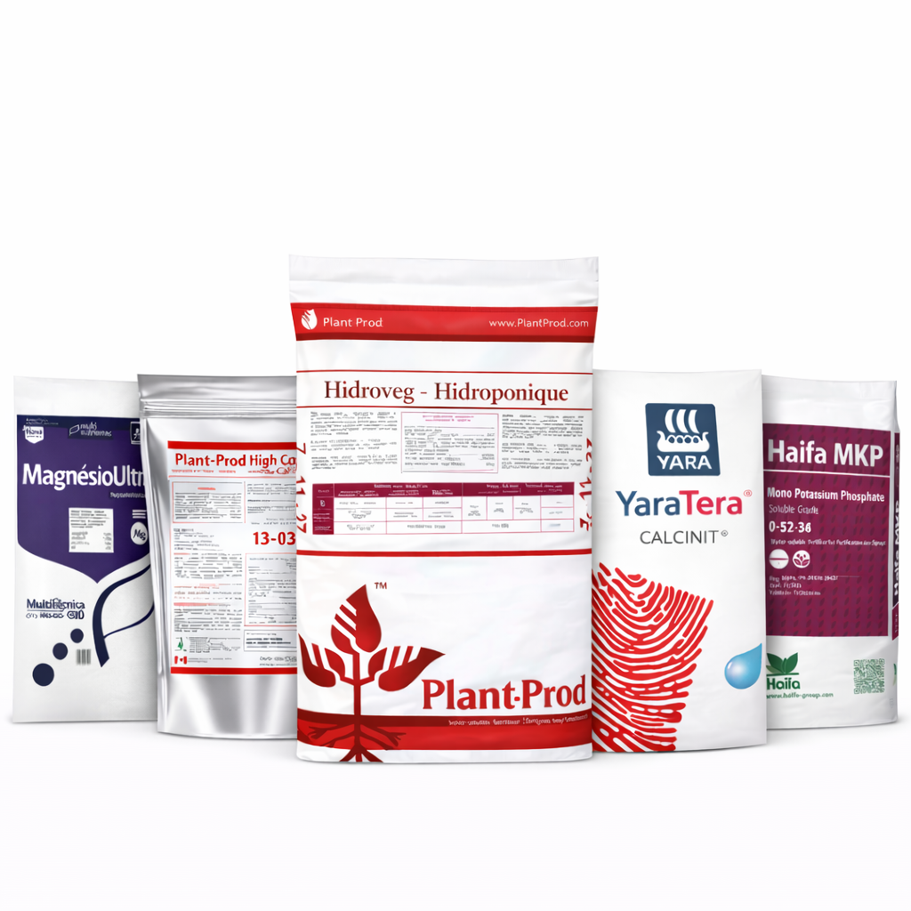 O Kit Plant-Prod 7-11-27 + Plant-Prod 13-0-13 + MKP 0-52-34 + Nitrato de Cálcio + Sulfato de Magnésio é um conjunto de adubos minerais (fertilizantes) 100% solúveis em água, desenvolvido para fornecer uma nutrição completa, com macronutrientes e micronutrientes essenciais ao longo de todo o ciclo da planta.